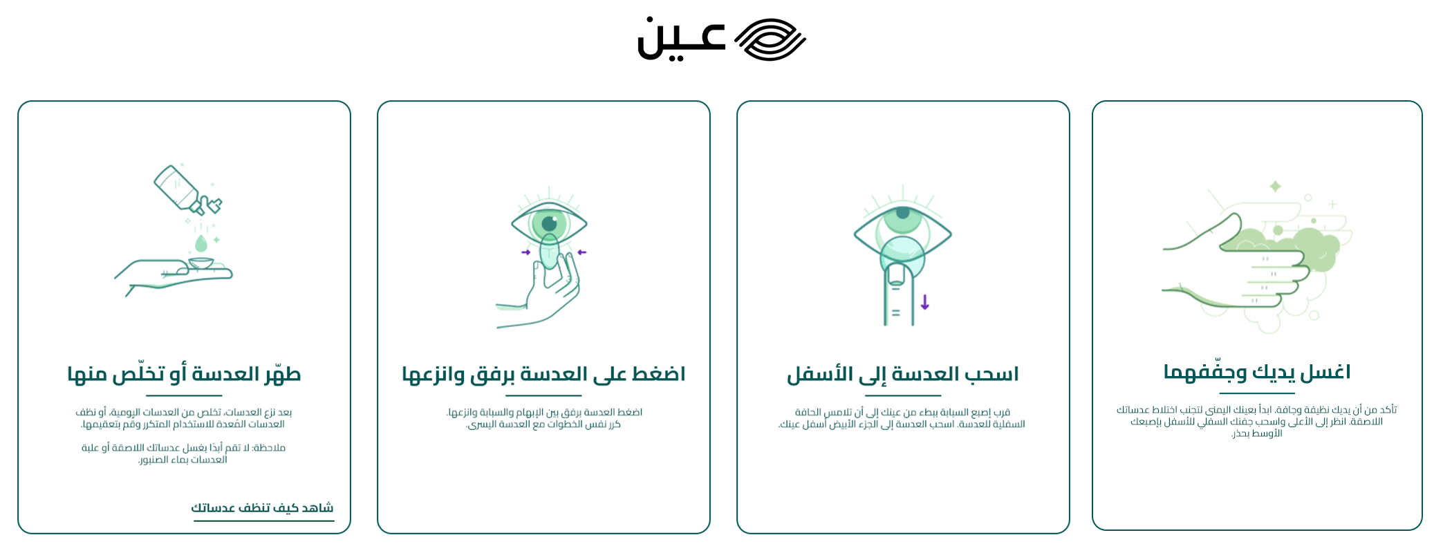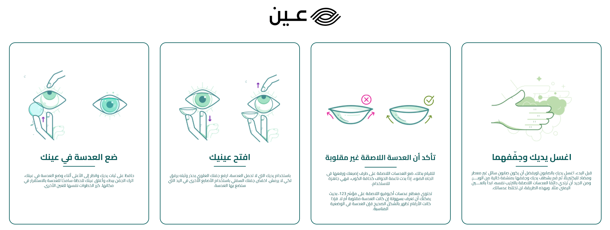 • نظافة العدسات وعلبتها: اغسل العدسات بالمحلول الخاص بها بعد كل استعمال وتهوية العلبة الحافظة باستمرار للحفاظ على النظافة.