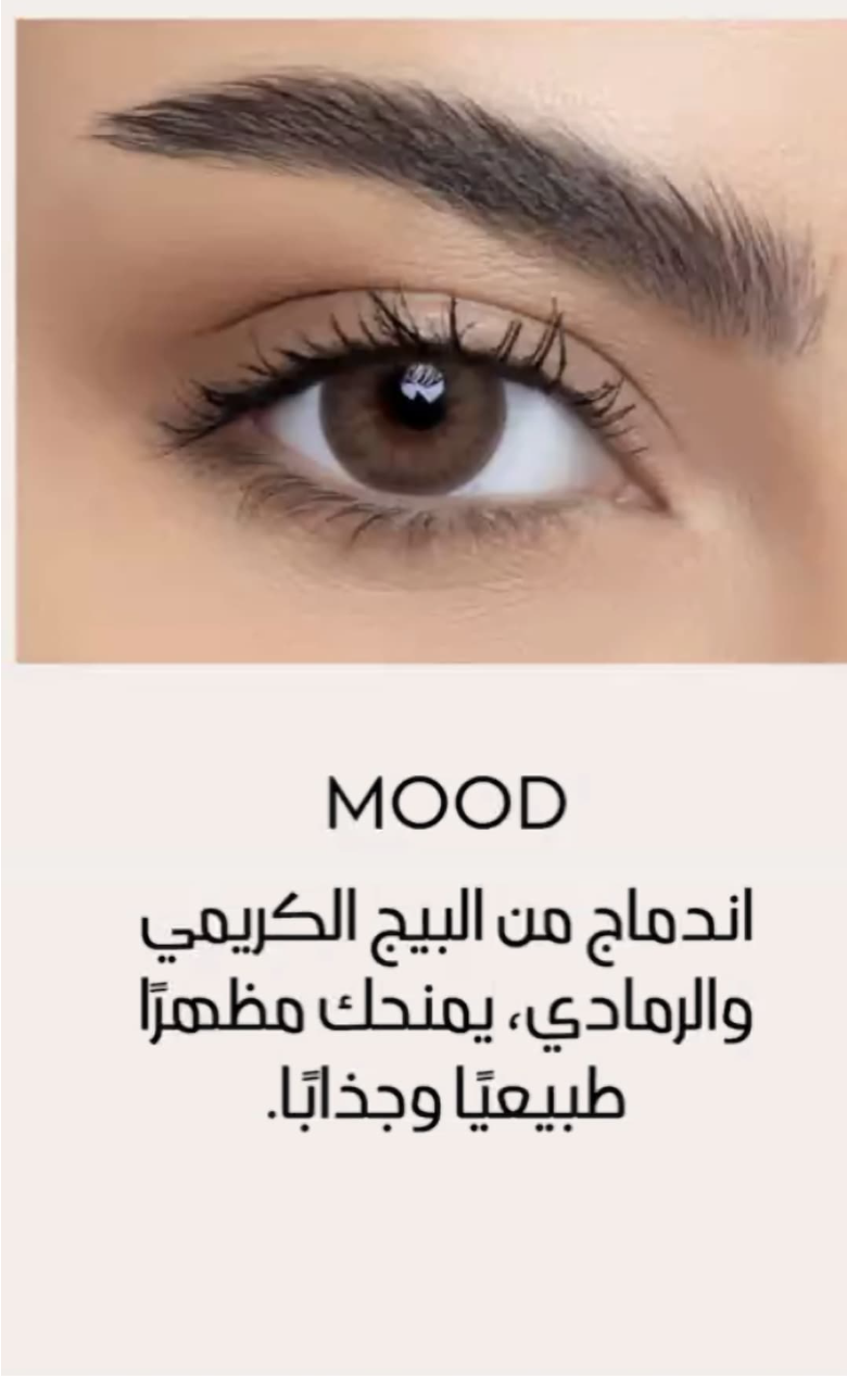 اندماج من البيج الكريمي و الرمادي ، يمنحك مظهرًا طبيعيًا وجذابًا. . تأتي بخاصية مبتكرة وفريدة ، حيث تسمح بمرور الاوكسجين من خلالها للعين مما يجعل العين بيضاء دون احمرار .